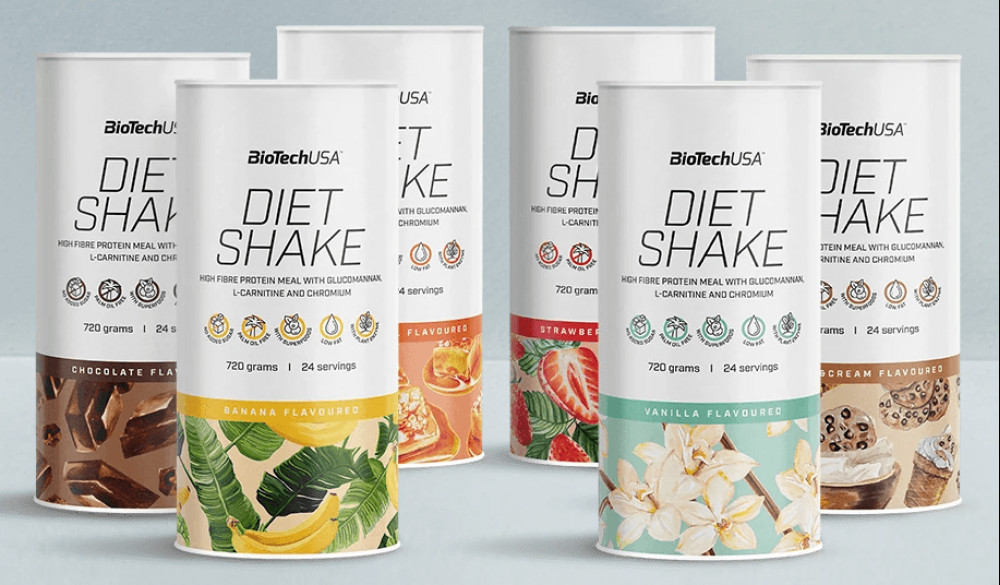 BioTech USA Diet Shake to smaczny dietetyczny shake białkowy z wysoką zawartością błonnika, glukomannanu, L-karnityny i chromu. Głównym składnikiem Diet Shake jest koncentrat serwatki, który jest uzupełniony 6 rodzajami rozpuszczalnego w wodzie błonnika pokarmowego (glukomannan, płatki owsiane, mielone psyllium, inulina, siemię lniane w proszku i błonnik cytrusowy). Psyllium i glukomannan są również często używane do żelowania lub zagęszczania, ponieważ mogą niezwykle skutecznie wchłaniać wodę, a w konsekwencji pęcznieć do kilkukrotności swojej wagi.